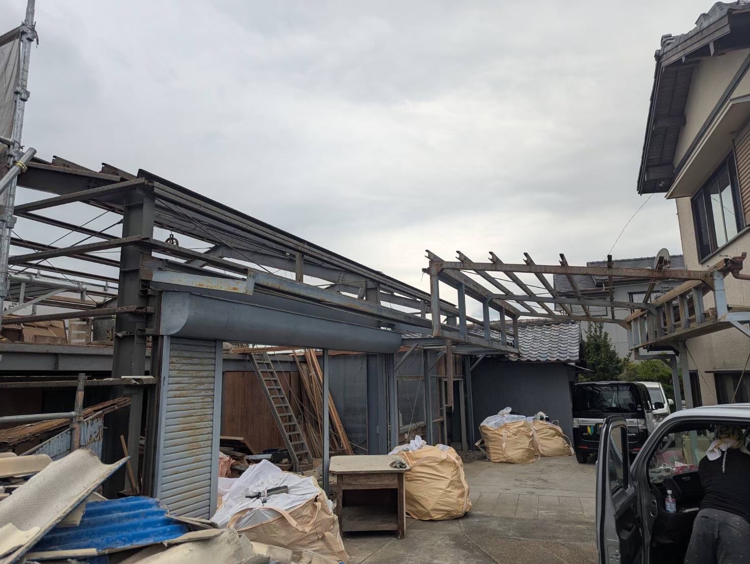複数の建物を同時に解体するため、作業エリアを明確に区分し、安全確保を最優先に作業を進めました。瓦や建材の落下防止対策、粉塵の飛散防止など、現場の状況に応じた安全対策を実施。また、鉄骨倉庫の解体時には、構造の安定性を確認しながら慎重に作業を進めることで、事故ゼロを達成しました。